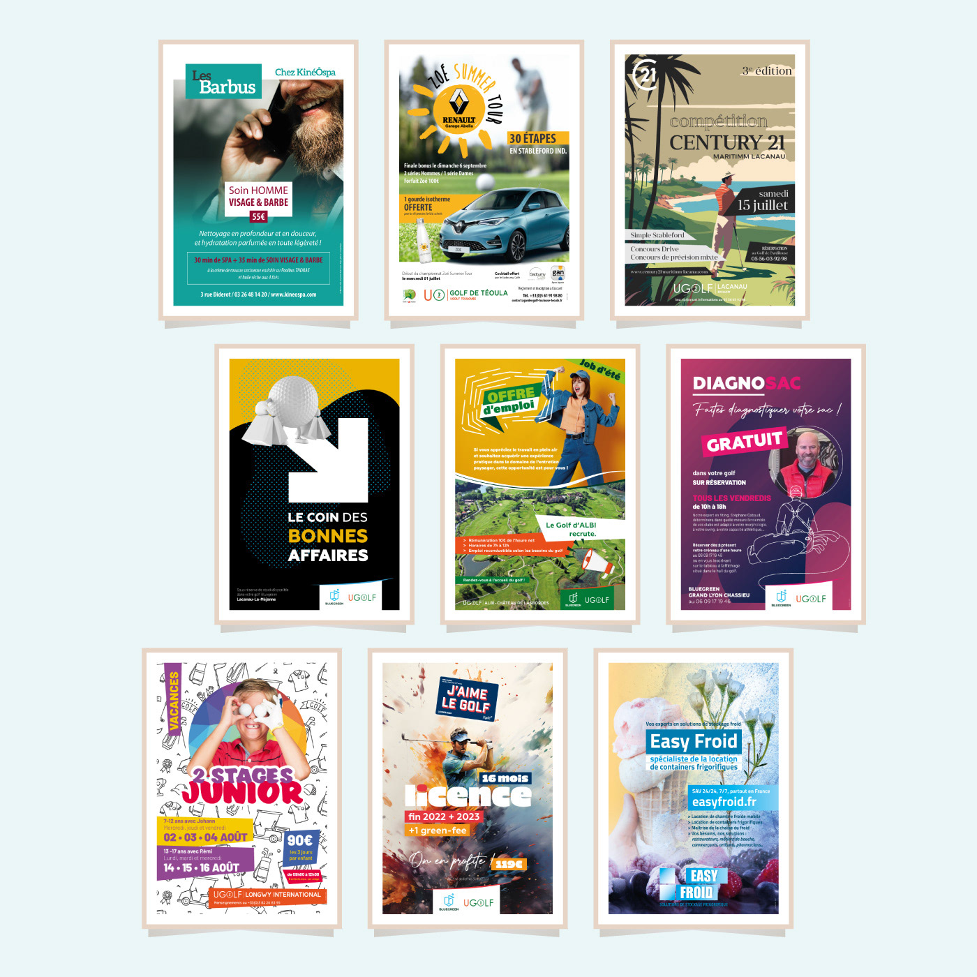 Extraits de visuels format A4, version affiche ou publicités magazines. Déclinés aux divers formats pour la communication sur les réseaux.